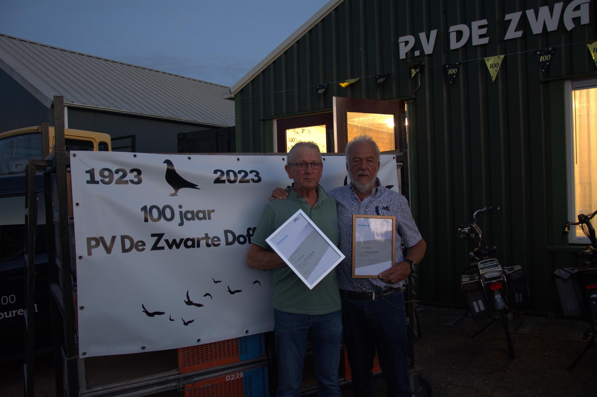 Tijdens het 100-jarig jubileumfeest van PV De Zwarte Doffer op woensdag 23-08-2023 zijn de heren Anne Lenis (links op de foto) en Iepe Jelsma door de NPO (Nederlandse Postduivenhouders Organisatie) in het zonnetje gezet. Dit vanwege hun inzet de afgelopen decennia voor de duivensport. De NPO heeft dat bekroond met een bronzenspeld voor Iepe voor al zijn inzet voor de Zwarte Doffer. Anne zet zich al meer dan 30 jaar met groot enthousiasme in voor de jeugd van de Friese duivensport. Daarnaast bepaalt hij tevens mede de hokcoördinaten binnen de Afdeling.